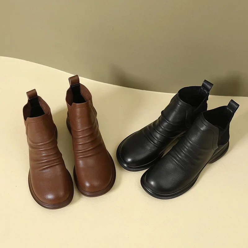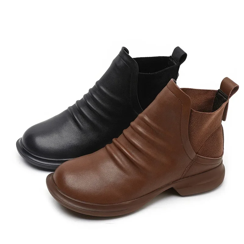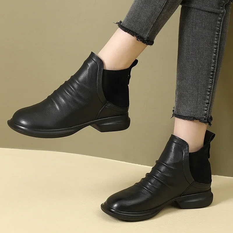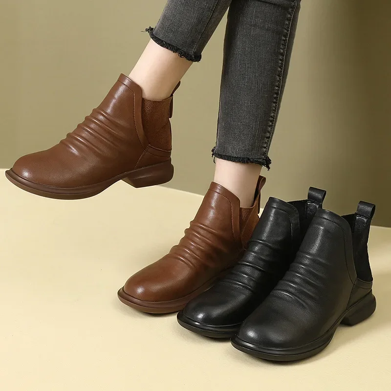 2025 Genuine Leather Shoes Women Boots Autumn Winter Fashion Handmade Ankle Boots Warm Soft Outdoor Casual Flat Shoes