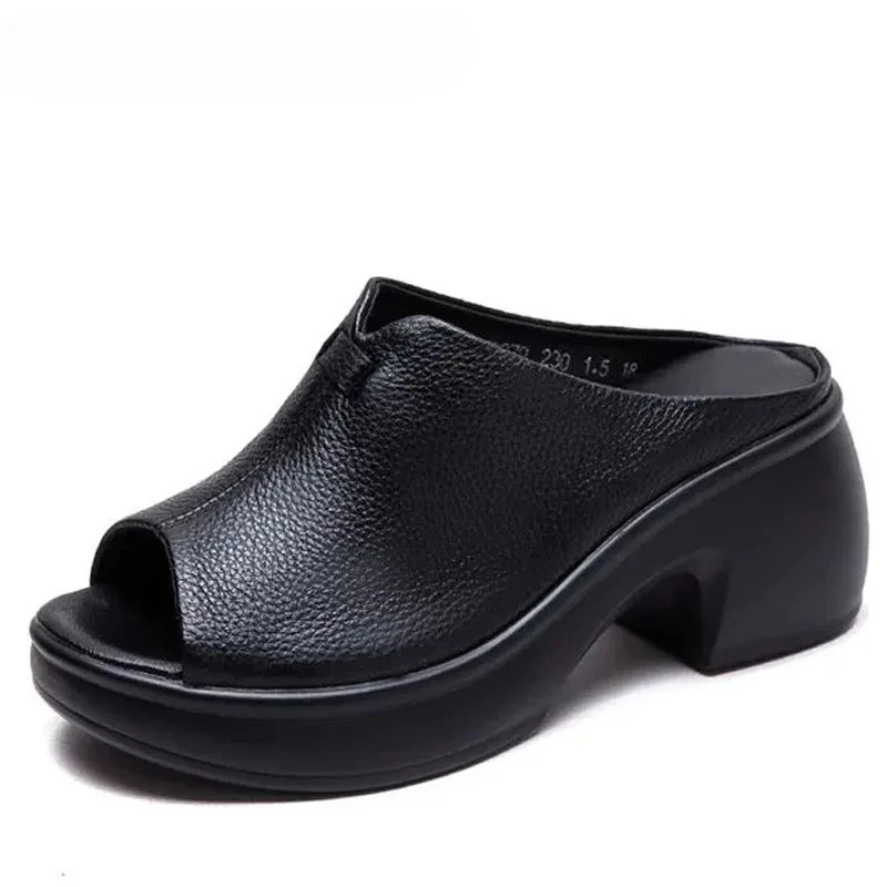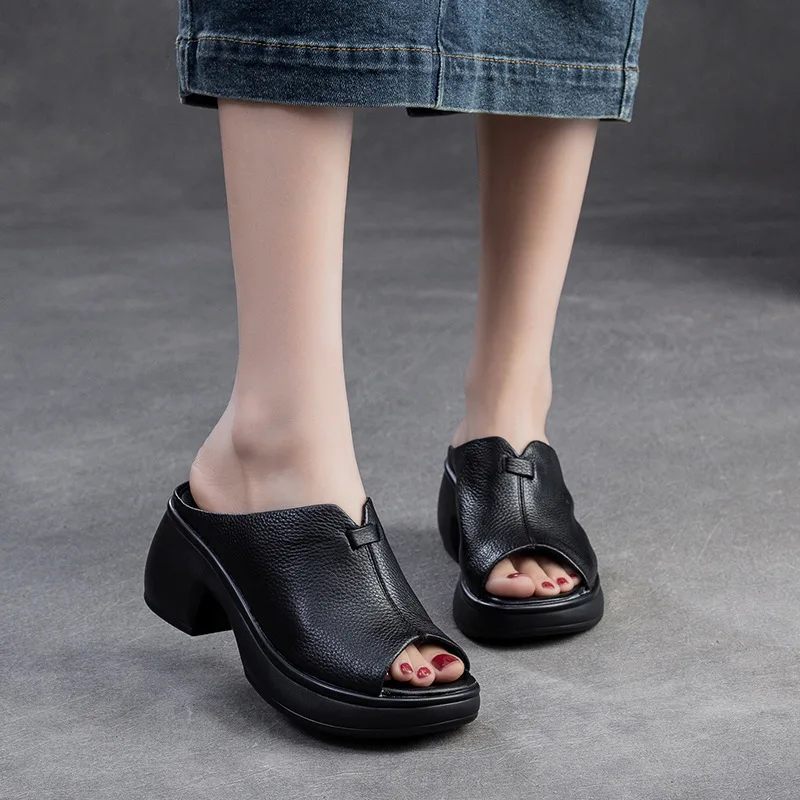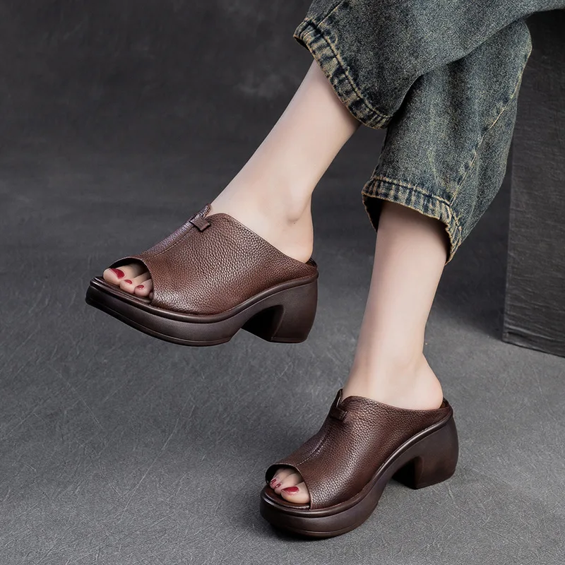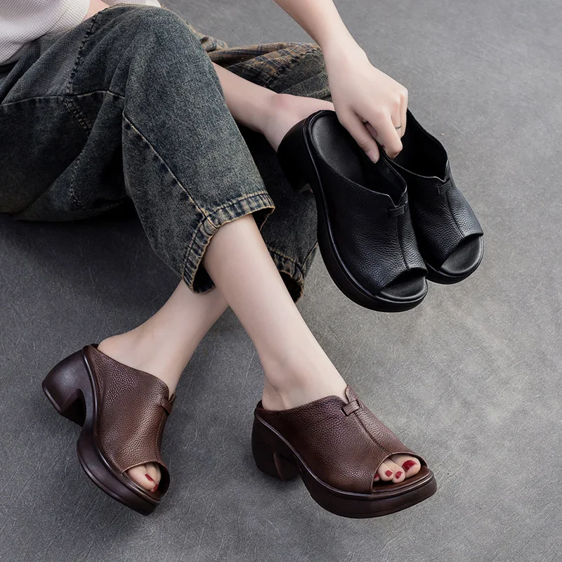 2025 Retro Genuine Leather Flat Sandals Summer Round Toe Soft Sole Cowhide Versatile Women's Shoes