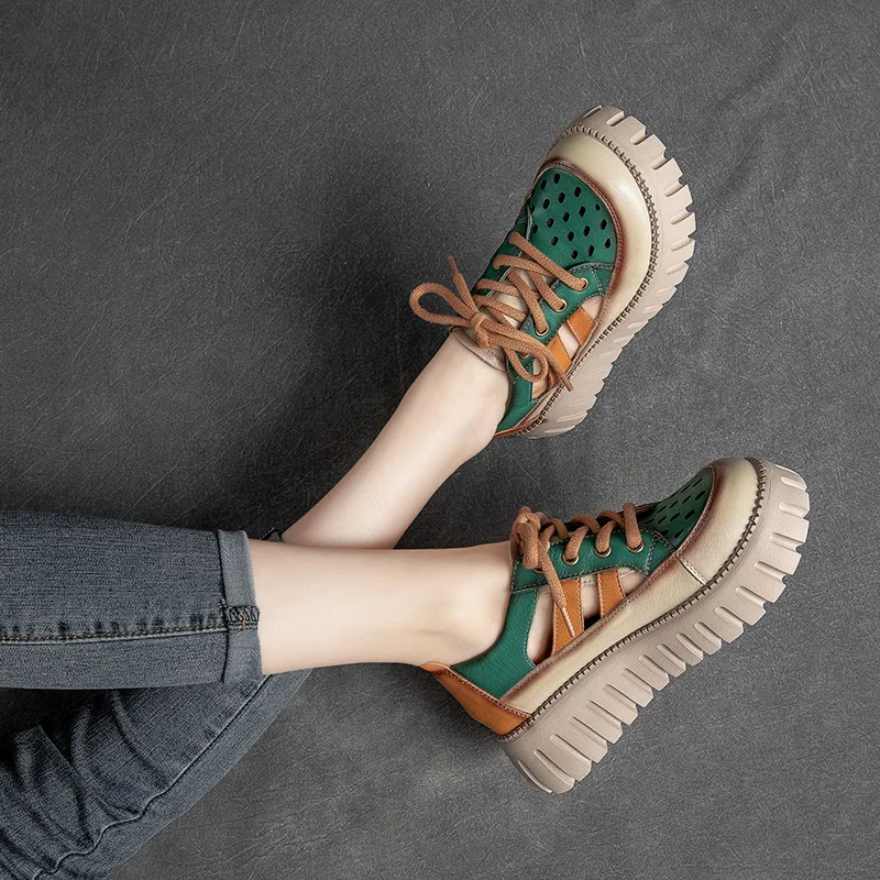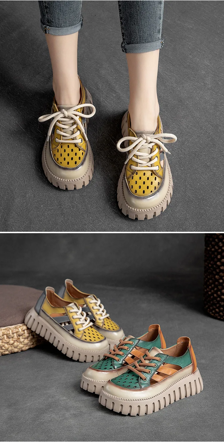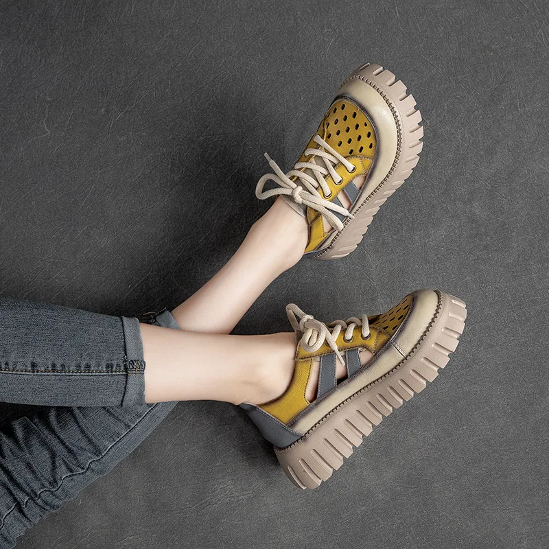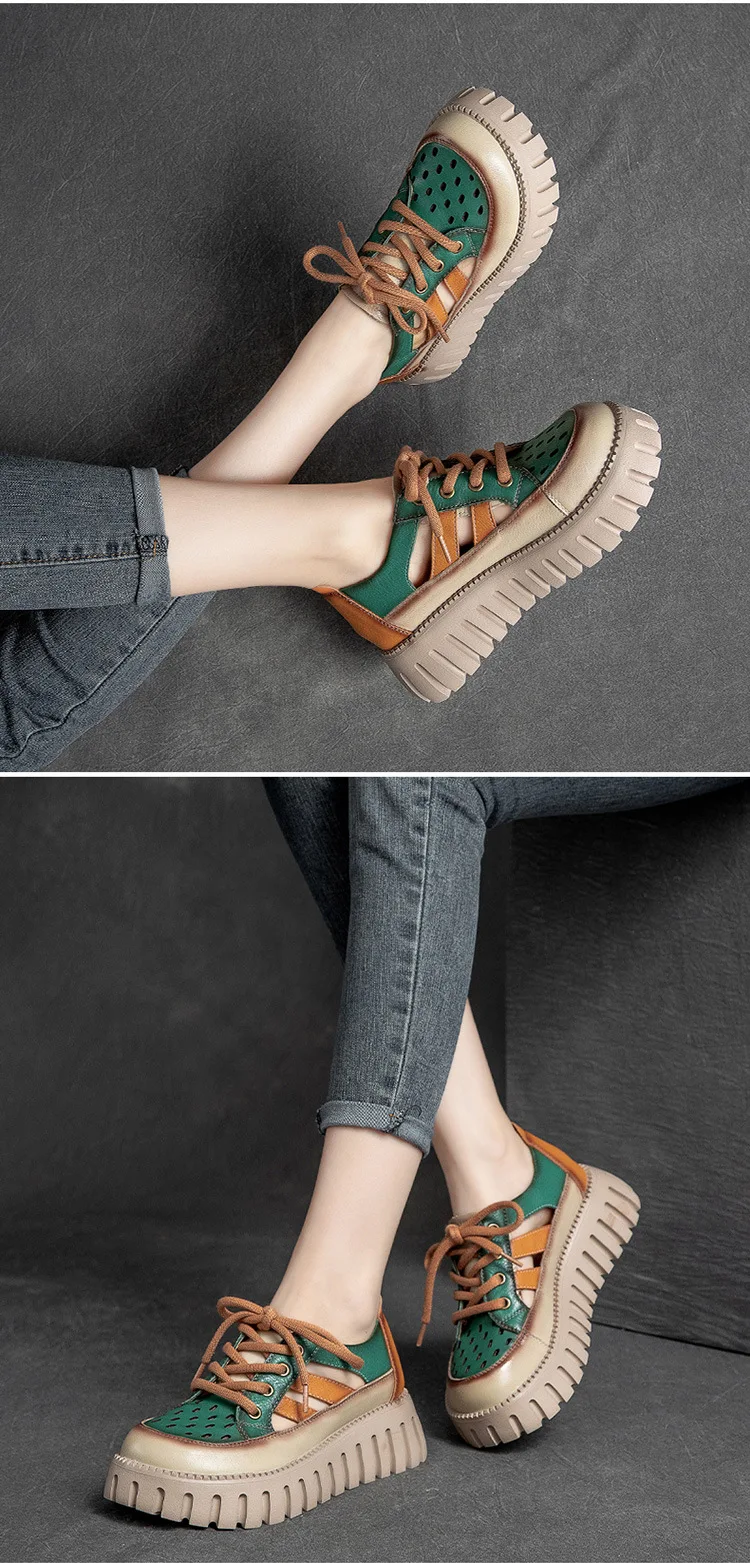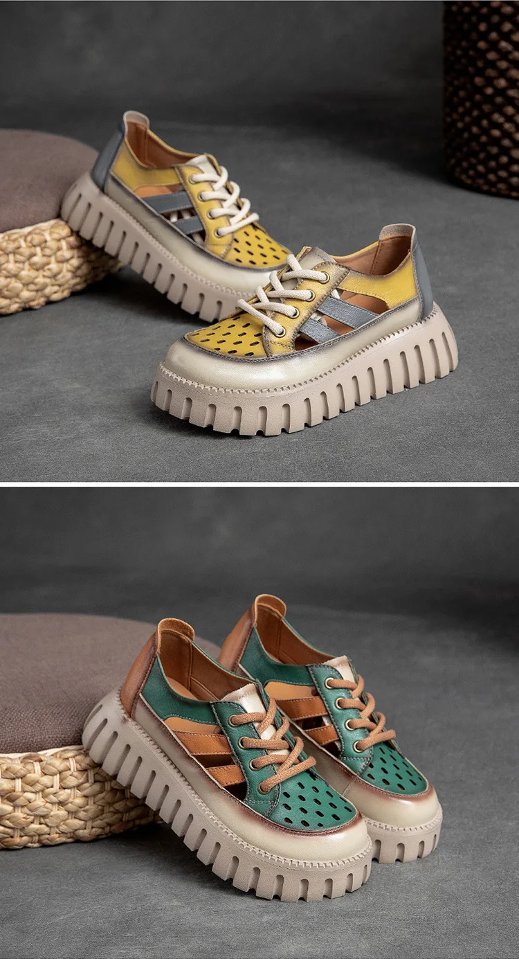 5.5cm Women Sandas Hook Summer Hollow Ankle Flats Breathable Shoes Weave Natural Cow Genuine Leather Boots Comfy Rubber