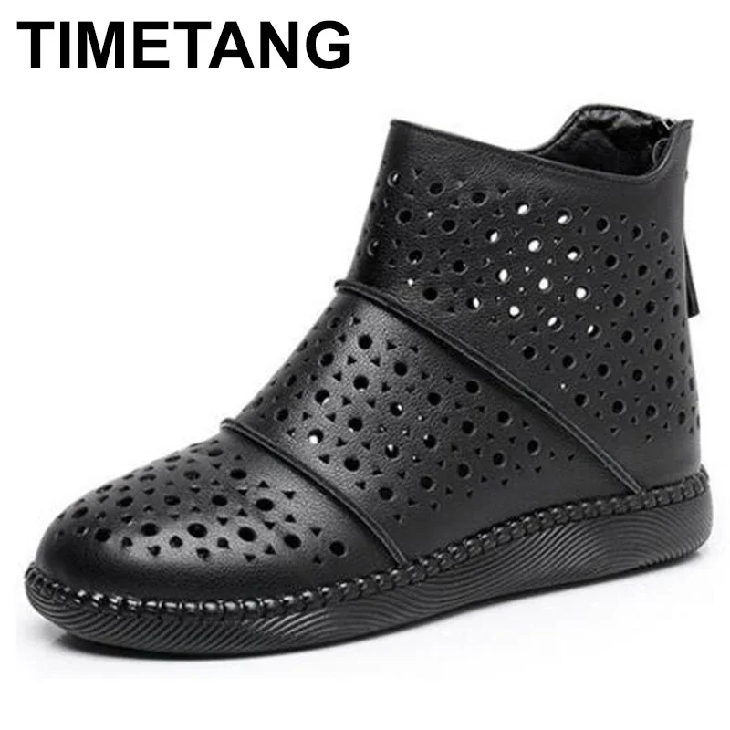 2025 Hollow Out Women Summer Big Head Sewn Breathable Hollow Ankle Genuine Leather Flats Zip Sandals