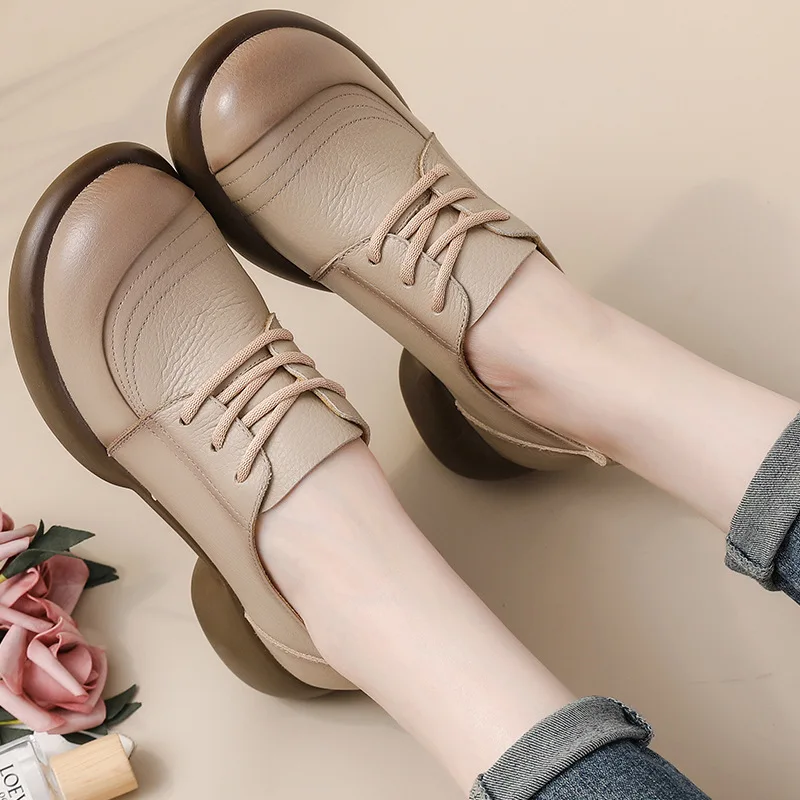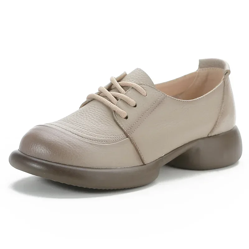 2025 Women Genuine Leather Shoes Spring Lace-Up Round Toe Genuine Leather Thick Heel Casual Shoes
