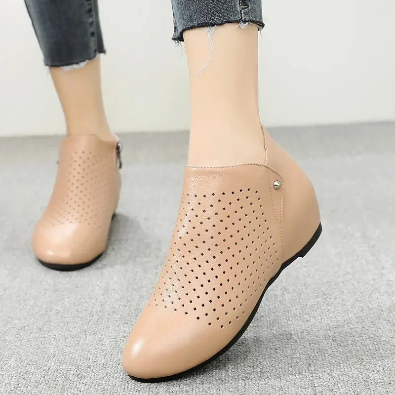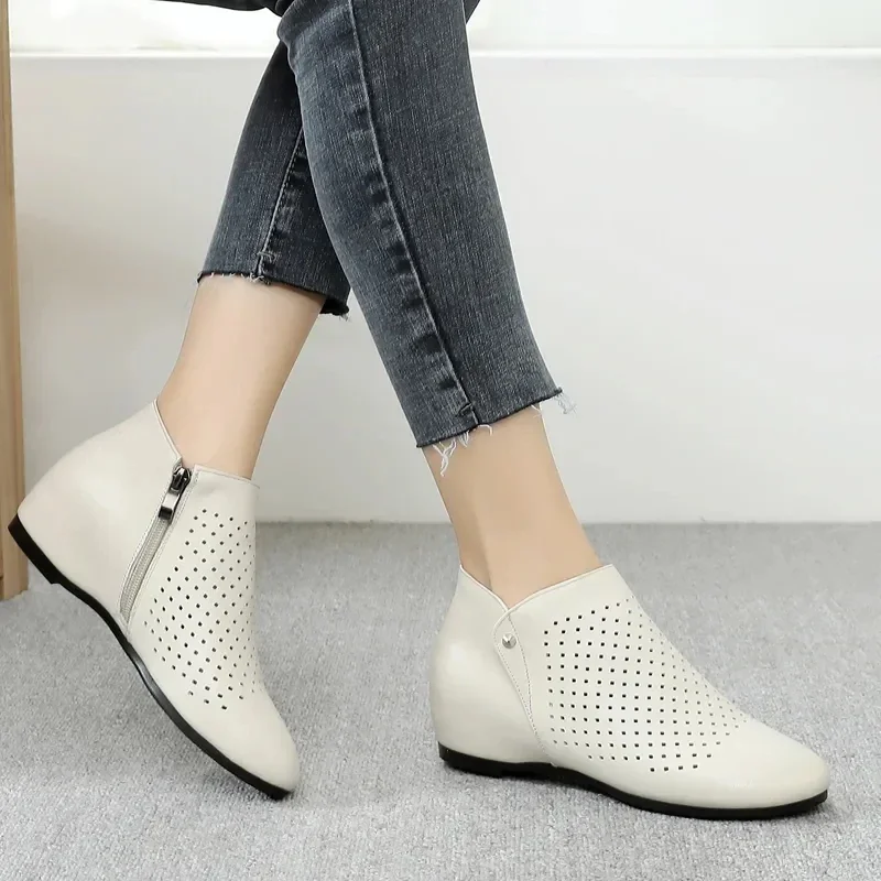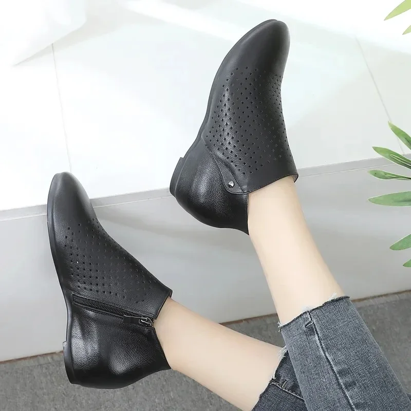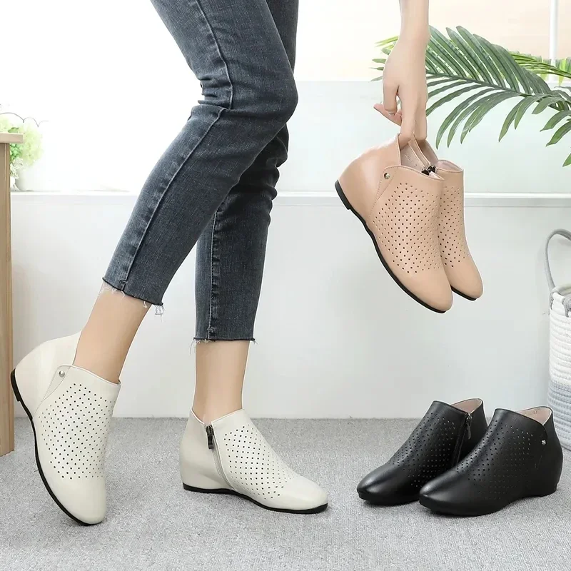 2025 Genuine Leather Summer Women Ankle Boots Flower Cutout Breakthrough Trends Low Heels Round Toe Beige Black one pair