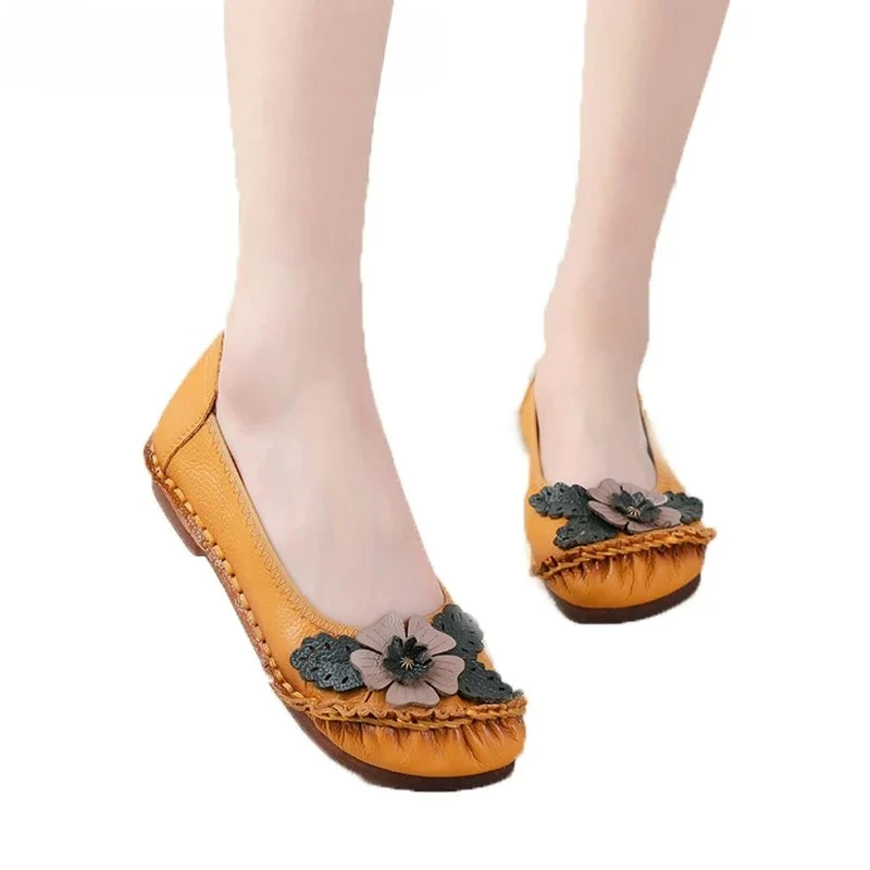 Women Flats Shoes 2024 New Spring Round Toe Lace-up Genuine Leather Casual Loafers Handmade Comfortable Shoes