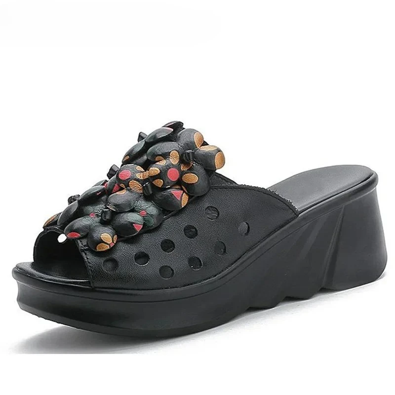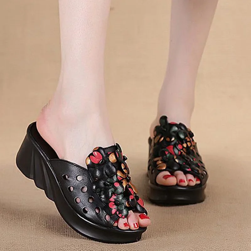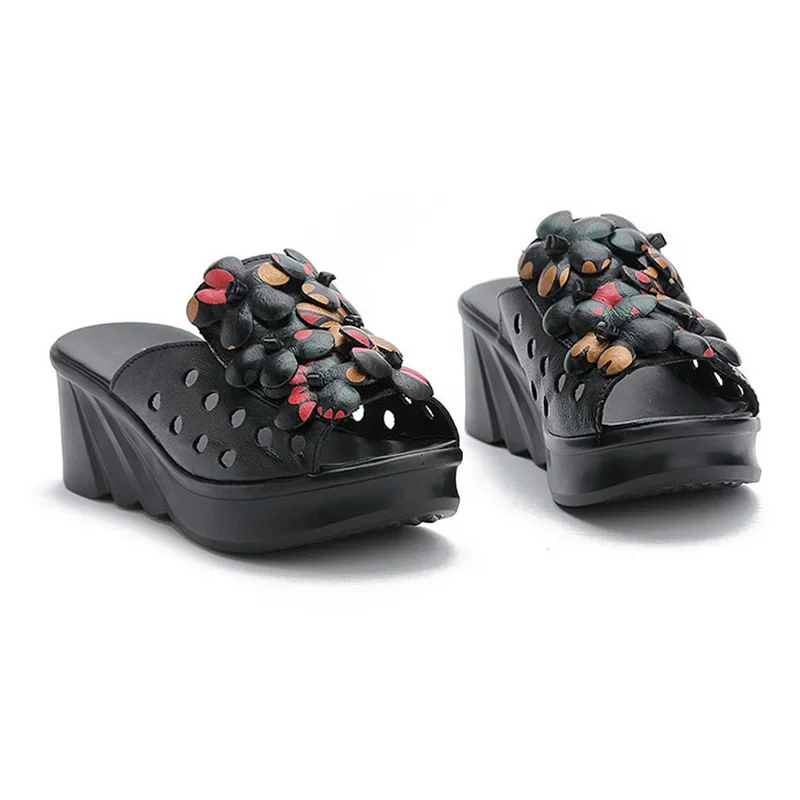 5.5cm Women Sandas Hook Summer Hollow Ankle Flats Breathable Shoes Weave Natural Cow Genuine Leather Boots Comfy Rubber